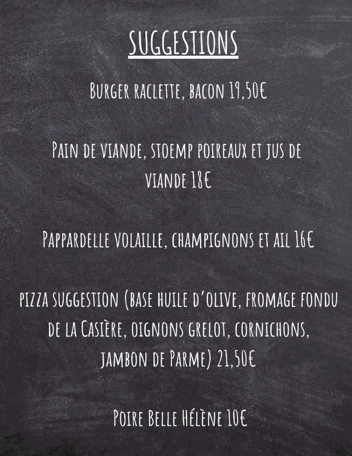 - à la carte : entrées, pâtes, viandes, salades, plats enfants, fondues, desserts